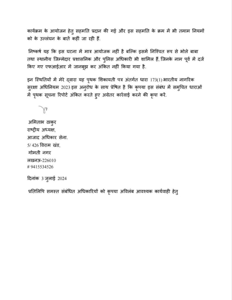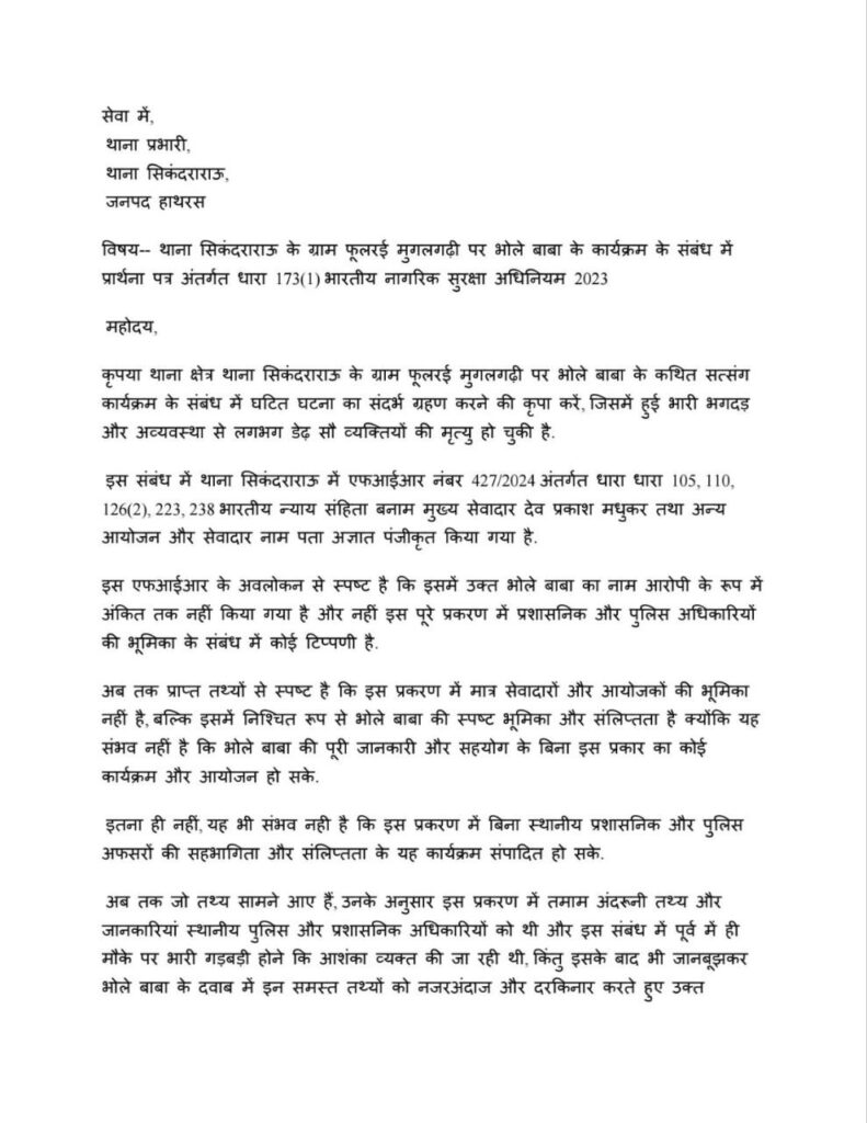 उन्होंने आगे लिखा, “निष्कर्ष यह कि इस घटना में मात्र आयोजक नहीं है बल्कि इसमें निश्चित रूप से भोले बाबा तथा स्थानीय जिम्मेदार प्रशासनिक और पुलिस अधिकारी भी शामिल हैं, जिनके नाम पूर्व में दर्ज किए गए एफआईआर में जानबूझ कर अंकित नहीं किया गया है। इन स्थितियों में मेरे द्वारा यह पृथक शिकायती पत्र अंतर्गत धारा 173 (1) भारतीय नागरिक सुरक्षा अधिनियम 2023 इस अनुरोध के साथ प्रेषित है कि कृपया इस संबंध में समुचित धाराओं में पृथक सूचना रिपोर्ट अंकित करते हुए अग्रेतर कार्रवाई करने की कृपा करें।”