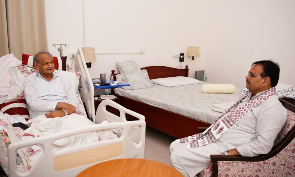 पूर्व मुख्यमंत्री अशोक गहलोत ने सोमवार को मुख्यमंत्री भजनलाल शर्मा से मुलाकात की….. दोनों के बीच ये एक शिष्टाचार भेंट हुई…… इस मुलाकात को लेकर सियासी हलके में कई मायने निकाले जा रहे हैं…..