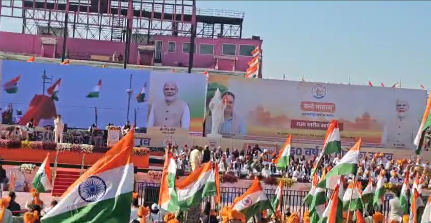 जयपुर: राष्ट्रगीत वंदे मातरम् के 150 वर्ष पूर्ण होने के उपलक्ष्य में वर्षभर चलने वाले “वंदे मातरम्@150” महाअभियान का शुभारंभ शुक्रवार को जयपुर के सवाई मानसिंह स्टेडियम में हुआ। राज्य स्तरीय इस मुख्य समारोह में मुख्यमंत्री भजनलाल शर्मा ने भाग लिया। कार्यक्रम में करीब 50 हजार लोगों ने एक साथ वंदे मातरम् का सामूहिक गायन किया। प्रदेशभर में भी इसी अवसर पर अनेक कार्यक्रम आयोजित किए गए, जिनमें भाजपा सांसद, विधायक एवं कार्यकर्ताओं ने विभिन्न स्थानों पर भाग लिया।